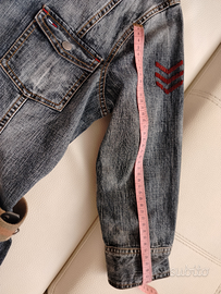 Vestito donna jeans Tommy Hilfiger tg L, 86% cotone 15% poliestere 1% spandex, manica 3/4, rifiniture e cintura elastica colore maculato verde/marrone, 2 taschini al petto con chiusura bottone a pressione, perline rosse sulla manica. Usato una sola volta.