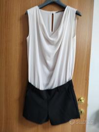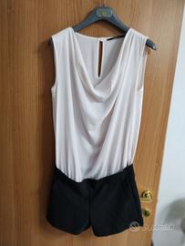 fresco mini abito senza maniche della Hozone. la parte di su è bianco panna mentre la parte di sotto è un pantaloncino di colore nero. taglia indicata M (spalle 38 centimetri, lunghezza 80 cm). il pantaloncino ha due tasche e una zip laterale, la parte superiore prevede un piccolo bottoncino posteriore. il vestito è made in italy ed è praticamente nuovo. senza difetti viene spedito lavato e stirato.