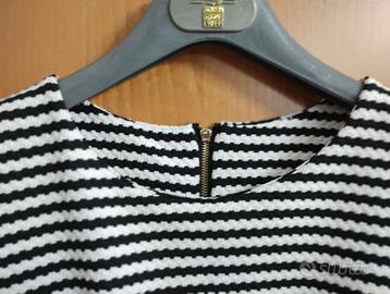 fresco ed elegante vestito da donna a righe orizzontali bianche e nere. Fascia in vita di colore nero. girocollo, a maniche corte e con cerniera posteriore. taglia indicata S (spalle 38 cm, lunghezza 86 cm). il vestito è made in italy e praticamente pari al nuovo. senza difetti, morbido e lucente viene spedito lavato e stirato.