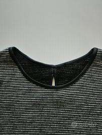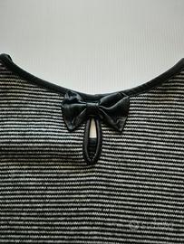 Vendo vestito da donna nero a righe, elegante e comodo. Maniche 3/4 Tasche laterali Dettaglio fiocco sul retro Tessuto elasticizzato (85% acrilico, 5% elastico) Taglia 2 (circa S/M) Perfetto per uso quotidiano o outfit casual/ elegante. ottime condizioni. Spedizione veloce