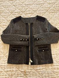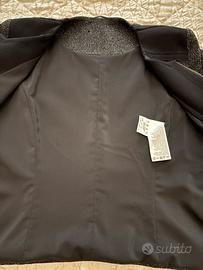 Completo donna (giacca e abito) elasticizzato. Abito maniche corte,in lurex, con inserti in lana e grogren, scollo arrotondato, cerniera posteriore; giacca maniche lunghe, completamente foderata, cerniera centrale a dobbia apertura, piccole tasche e polsini impreziositi da bottoni dorati