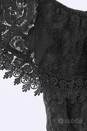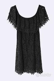 Vendesi abito corto da donna in cotone e pizzo nero. Modello con scollo Bardot (spalle scoperte) e doppia balza. Ottima fattura, pizzo pesante e ben rifinito. Stato: Come nuovo.