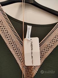abito donna colore verde militare con bordo collo e maniche lavorate beige. Taglia unica. New Collection