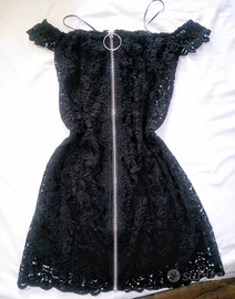 Tubino nero tutto in pizzo non trasparente perché con sottoveste, corto da metà coscia, marca Mango, usato un paio di volte pari al nuovo, cerniera centrale frontale che corre su tutta la lunghezza del vestito, senza maniche ma con piccole spalline sulle braccia, scollo dritto, vestito aderente che segue le forme. Taglia S veste bene anche per una XS.