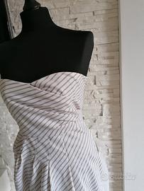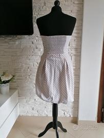 Abitino taglia S, senza maniche da donna, scollo a cuore, arricciatura elastica posteriore e gonna corta a palloncino.