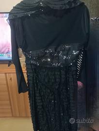 Completo estivo in jersey vestito lungo con balze in velo e paillettes nero taglia unica con giro seno cm 84 max 92 con il suo bolero c'è anche in colore blu elettrico