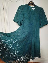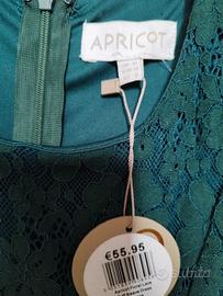 abito nuovo con cartellino marca Apricot color verde bottiglia in tulle lavorato e completamente foderato. chiusura con zip nella parte posteriore del vestito manica al gomito a sbuffo. Modello a ruota