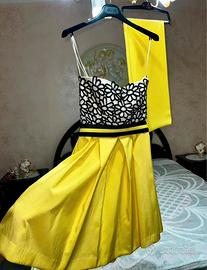 Top con fiori in rilievo neri e base panna, super chic. Gonna gialla a pieghe, con taglio elegante che valorizza la figura.