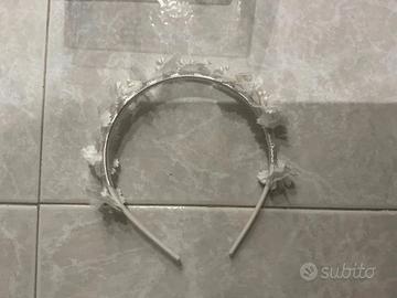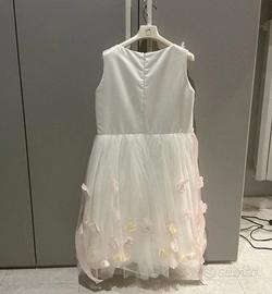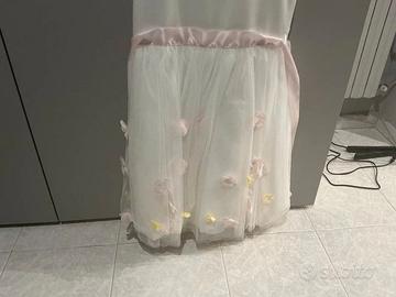 Delizioso vestito elegante per bambina, perfetto per cerimonie, battesimi, comunioni o occasioni speciali. Colore bianco con dettagli floreali in rilievo rosa e giallo sulla gonna in tulle, cintura in raso rosa con fiocco laterale e applicazioni floreali sulla spalla. Incluso anche cerchietto coordinato con decorazioni floreali.