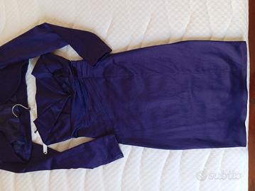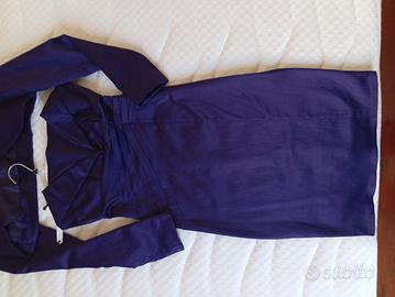 vestito viola lucido ideale per cerimonie, stile tubino con spacco dietro e coprispalle abinato