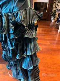 Vestito per eventi, di seta color pettolio , spalle dcoperte , busti tingirzato, a balze con leggera coda.