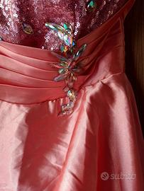 vestito elegante con paillettes ,colore rosa e arancione mantello cucito con stringhe nel corpetto, altezza vestito 66 cm, lunghezza totale 126 dietro