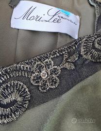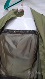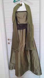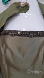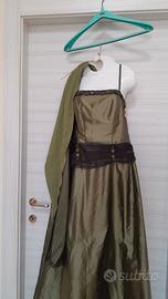 Elegante abito da sera con stola abbinata. - Tessuto lucido color verde oliva. - Dettagli ricamati sul corpetto. - Cintura in tessuto marrone scuro. - Stola in tessuto leggero coordinata. Da ascella ad ascella misura cm 50