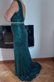 Vestito elegante da cerimonia color verde scuro con strass e pailettes a forma di sirena, senza maniche, con spacco a sinistra