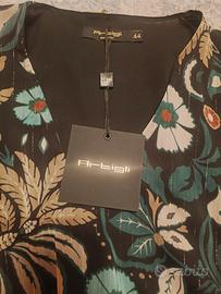 Vestito elegante donna con maniche velate. marca ARTIGLI. vendo per errata taglia, non ho potuto effettuare il reso in tempo utile. pagato 70 euro, vendo a 40. fantasia floreale in verde, nero e oro. tessuto elegante e chic
