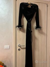 il vestito e nero lungo e con lo spacco laterale ,schiena scoperta che comprende una parte dei fianchi e la coda lunga dietro