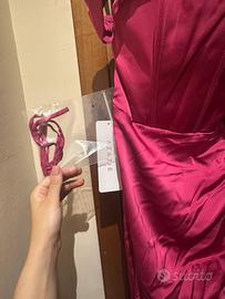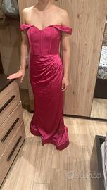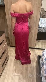 Vendo abito da cerimonia elasticizzato, marca Azazie, colore fucsia, con scollo a cuore e spalle scoperte. Il corpino è strutturato con stecche leggere per sostenere la figura, mentre la parte inferiore cade morbida con una leggera coda. Chiusura con eleganti bottoncini sul retro.
