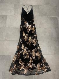Abito lungo con spacco, vestito da sera elegabte, ideale per matrimonio, battesimo, festa fi laurea , diciottesimo. Nuovo mai indossato. Nero con fiori in paillettes rosa antico. Romantico, con schiena scoperta e lacci ad incricio. Taglia S