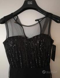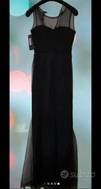 Vestito lungo elegante da donna Peccati di Moda. Con paillettes sul décolleté e tulle su tutta la lunghezza del vestito. Sulla schiena tessuto trasparente e chiusura con zip e bottone.