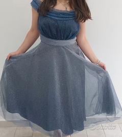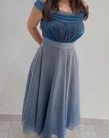 Vendo splendido abito da cerimonia elegante taglia S glitterato blu sfumato con scollo a barca. Completo di custodia per l abito. Indossato una sola volta, in perfette condizioni €20