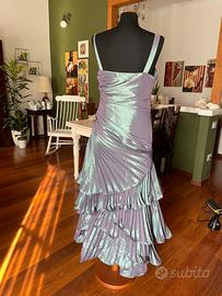 Vestito lungo in seta per cerimonia o evento di gala. Taglia 46/48. Di colore gangiante usato una volta in ottime condizioni. Con balze plisettate e coprispalle