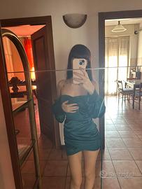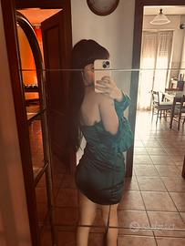 vestitino scollato con maniche lunghe ,abbastanza corta con dei bottoncini sulle maniche e sulle coppe ,con cerniera per chiudere dietro la schiena e il filo per legarlo meglio al corpo,messo due volte,non c’è etichetta
