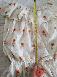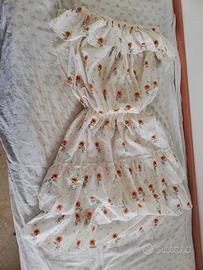 Bellissimo, vaporoso e comodo vestito da donna. Ideale per l'estate e per tutte le forme fisiche: pur essendo "coprente"(la gonna è abbastanza lunga e non ci sono grandi scollature), è molto ampio e vaporoso. La parte superiore del vestito è costituita dal corpino e da un ampio volant che si può scegliere se portare sceso sulle spalle (lasciando collo e spalle scoperte) o più aderente al collo (lasciando stavolta le braccia scoperte). La parte inferiore (la gonna) è molto ampia e fa una bellissima ruota. Il colore è esattamente quello che si vede in foto: fondo bianco, fiordalisi arancio e piccole fogliette azzurre. In vita è stretto da un elastico, cui si può aggiungere, per renderlo più completo, una cintura bianca o una fusciacca, magari arancio (non fornite). Veste una M ma, visto il taglio del vestito, anche qualche taglia di più o di meno. Vestito vintage· risale agli anni 70! La bellezza e freschezza di questo vestito non devono essere nè descritte nè spiegate... basta guardarlo!!!