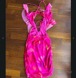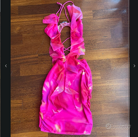Vestito scollato davanti con lacci sulla scollatura e aperto dietro. Solo provato. Taglia S. Fantasia e tulle