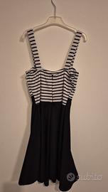 vendo causa inutilizzo vestito estivo elegante, gonna corta a campana. Imbottito zona petto, il vestito è nero/bianco e i bottoni color oro. In ottime condizioni siccome usato poco