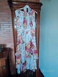 Un bellissimo abito lungo, fresco, estivo, con motivi floreali, fodera bianca e cintura a tema floreale. Marca Camomilla, taglia 42. Praticamente mai indossato perché, acquistato per un regalo, è poi risultato di una taglia più piccola ed era troppo tardi per cambiarlo. Manca la confezione originale ma ha ancora il cartellino attaccato.