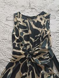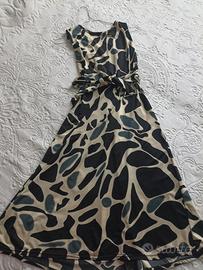 vestito estivo taglia S in viscosa con scollo a V sul davanti e incrocio sotto il seno. morbido sui fianchi. sul retro nessun scollo. fascia in vita da legare in vita. lungo alle ginocchia. core panna/nero/grigio. senza maniche. quasi nuovo. molto fresco