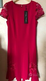 Chiusura con zip invisibile e piccolo gancetto. Ricamo floreale nella parte finale del vestito. Maniche completamente in ricamo con bordo in simil raso.