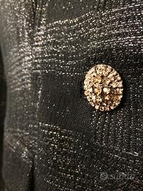 Il vestito è composto da un tubino abbinato ad una giacca con chiusura a bottone gioiello (particolare in foto)