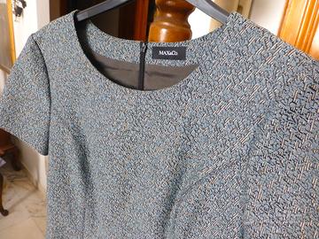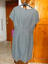 Vestito grigio turquoise in tessuto con pattern floreale in rilievo, tipo broccato. Modello tubino, lunghezza appena sopra il ginocchio. Mai usato. Senza difetti o segni di usura. Fodera intatta. Chiusura a scomparsa sul retro. Marca Max&Co, taglia italiana 46 (France 44).