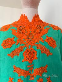 Eleva il tuo guardaroba con questo splendido abito kaftano lungo Gucci in lino verde acqua, caratterizzato da uno squisito ricamo floreale/applicazione in pizzo arancione vibrante. 🕊️✨