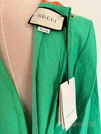 Disegnato da Alessandro Michele, questo capo incarna la fusione distintiva del marchio tra eleganza bohémien e fascino massimalista. La silhouette ampia e fluida e le maniche larghe e lunghe offrono comfort e una vestibilità lussuosa, mentre gli intricati dettagli arancioni creano un contrasto accattivante. Perfetto per una fuga in un resort, una serata elegante o per fare una dichiarazione a un evento speciale. Realizzato in lino di alta qualità, questo abito è una vera testimonianza dell'impeccabile maestria artigianale di Gucci.