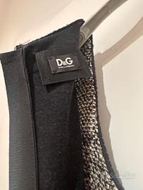 Vestito senza maniche in lana stretch D & G by Dolce e Gabbana taglia 40, lunghezza ginocchio, (misure lunghezza totale cm. 98, larghezza sottoascella cm 40, larghezza vita cm 36). Parte frontale lana mélange con profili in lana nera, retro panno grigio antracite.