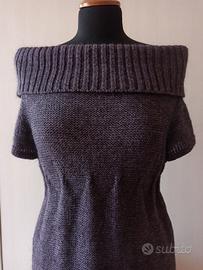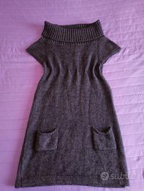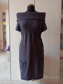 Vestito in maglia a maniche corte con collo molto ampio, che si può usare anche scoprendo le spalle. Il colore è una via di mezzo tra viola e grigio. Leggera arricciatura poco sotto al seno. Dotato di due taschine. Tessuto 40% lana, 30% mohair, 30% acrilico. Sull'etichetta non è segnata la taglia, ma veste una M.