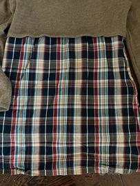 Vestito in misto lana e cotone, Laga,, taglia L, con un design a strati combinati. La parte superiore è un maglione color cammello mentre la parte inferiore è una gonna a quadri scozzese nei toni del blu scuro, rosso, bianco e beige,Un colletto a camicia bordeaux a pois bianchi spunta dallo scollo a V del maglione. Utilizzo versatile, ottime condizioni