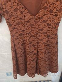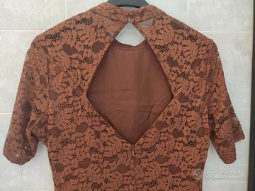 Vestito in pizzo color ruggine, con fodera interna, mezze maniche, accollato davanti e scollatura dietro a V, taglia Eu 42