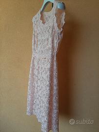 Vestito rosa in pizzo macramè, abito sartoriale con fodera a parte.Taglia S, lungo 87 cm, misura da vita a vita 37 cm, da ascella ad ascella 40 cm.Smanicato ma con spallina larga.Girocollo.