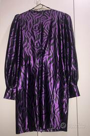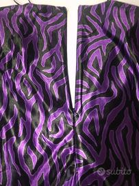 Vestito lilla e nero satinato in fantasia zebrata, con motivo in stoffa sulla parte anteriore. Zip sul retro, spalline imbottite e tessuto elasticizzato