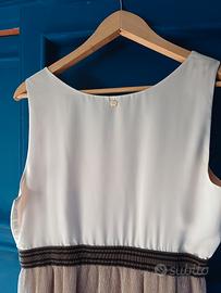 vestito stile impero, con corpetto tinta crema, fascia applicata marrone a righe nere, gonna tinta cipria trasparente glitterata con sotttogonna fino al ginocchio.