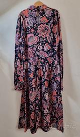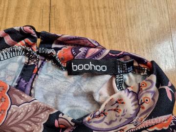 Vestito longuette in jersey di maglina, marca Bohoo taglia M o 42. Dettaglio collo alla coreana con bottoncini sul dietro. Fantasia floreale viola rosa e corallo su fondo nero.