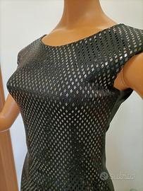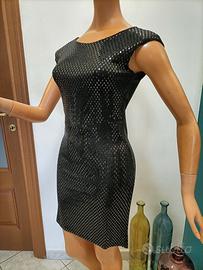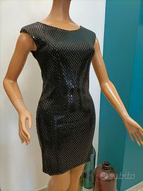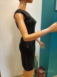 Vestito luccicante, girocollo, spalline imbottite, colore nero, elasticizzato. Composizione: 95% Poliestere - 5% Elastane. Taglia corrispondente ad una S. Misure: Spalle 41 Cm - Torace 34 Cm - Lunghezza 79 Cm. Video articolo e altri articoli disponibili sul profilo facebook 2EFFEMOD