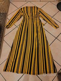 Elegante vestito lungo con una vivace fantasia a righe verticali. - Maniche lunghe. - Cintura in vita con fibbia. - Scollo a V.