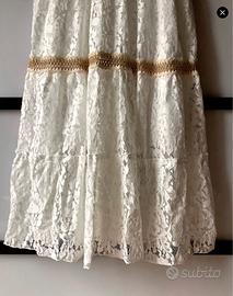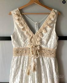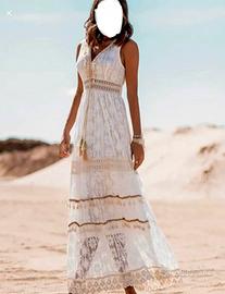 Bellissimo abito lungo, di boutique, in pizzo bianco di pregio, in stile boho chic, con passamanerie e pendagli, taglia M, foderato, elegante, di grande effetto indossato, nuovo, vendo a prezzo affare a soli 60 euro. Offertissima! + 12 euro per le spese di spedizione. MERAVIGLIOSO!
