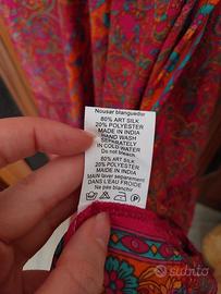 Vendo vestito lungo di seta a base fucsia con altri colori, bretelle regolabili, lacci sotto il seno. Buona vestibilità.