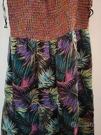 Corpetto elasticizzato effetto smock in tonalità calde aranciate e gonna svolazzante con fantasia tropicale multicolore (foglie nei toni del viola, verde, blu, giallo su fondo nero).