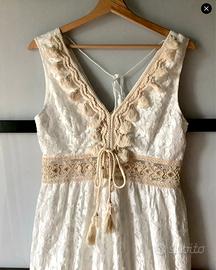 Bellissimo abito lungo, di boutique, in pizzo bianco di pregio, in stile boho chic, con passamanerie e pendagli, taglia M, foderato, elegante, di grande effetto indossato, nuovo, vendo a prezzo affare a soli 79 euro. Offertissima! + 12 euro per le spese di spedizione. MERAVIGLIOSO!
